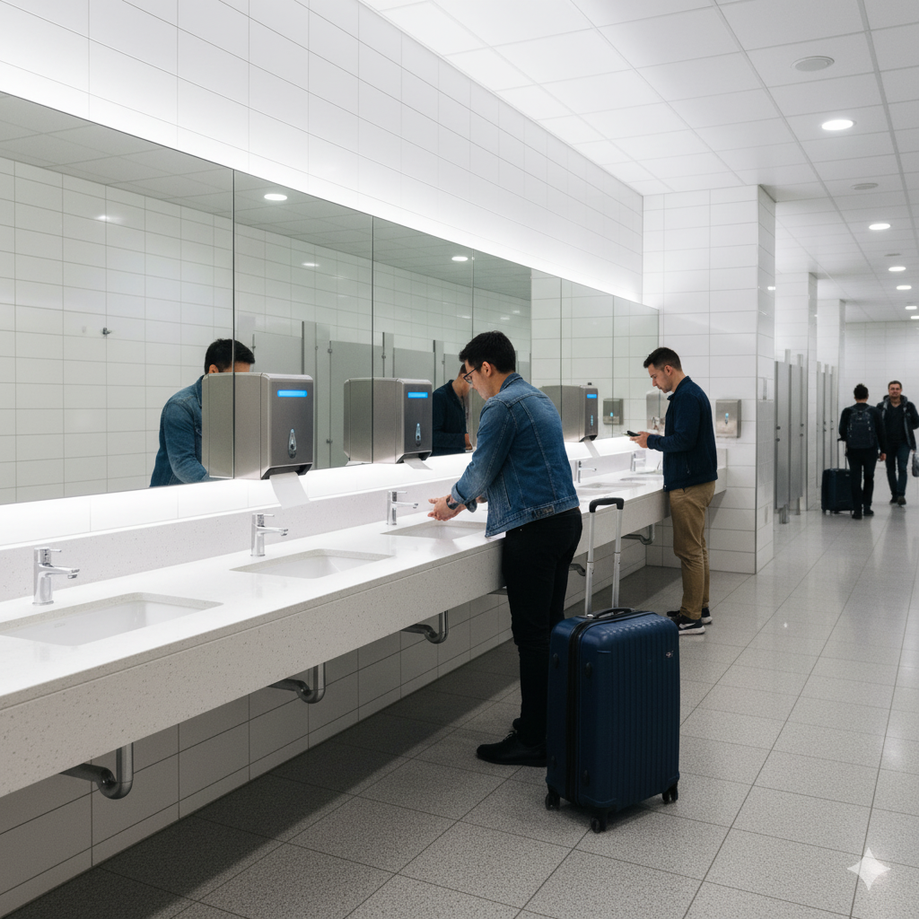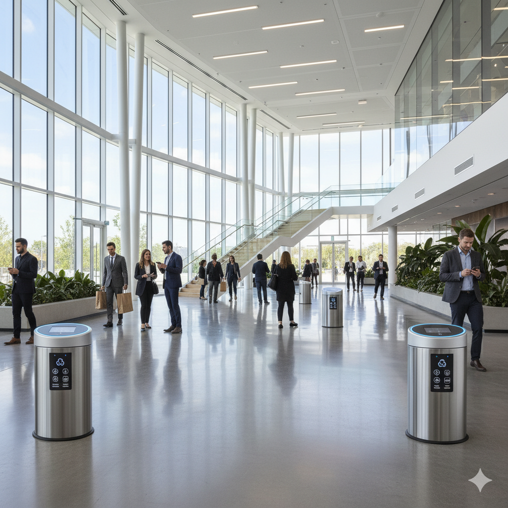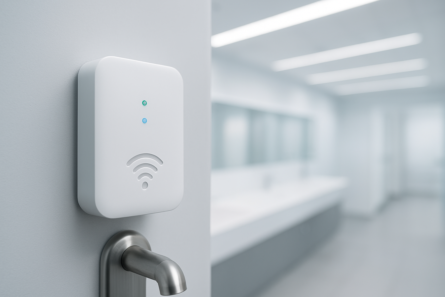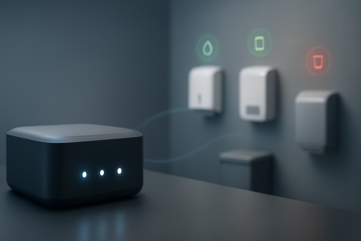 IoT sensors on dispensers and bins measure usage and send data to a central dashboard. AI forecasts refills, optimizes cleaning, and generates ESG reports. Staff receive alerts before supplies run out, ensuring continuous cleanliness.