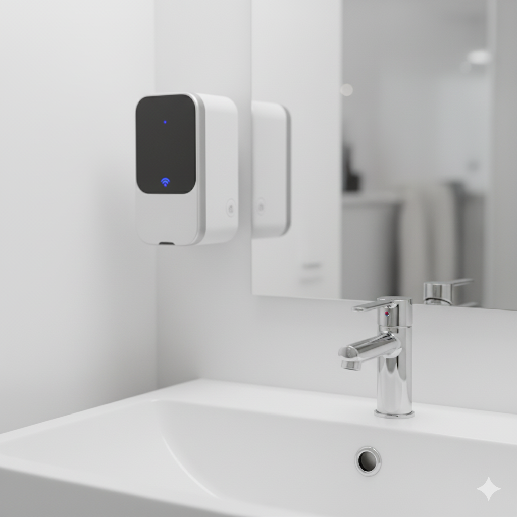Measures soap, paper, and trash levels with millimeter accuracy.